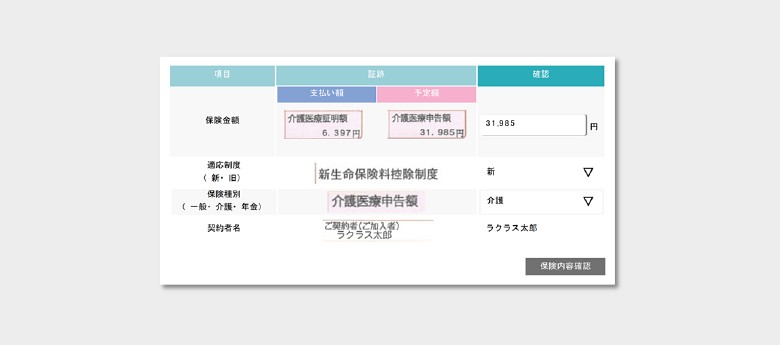 次の図をご覧ください。発行した保険会社ごとにフォーマットが異なったとしても、年末調整業務支援システムは読み取るべき領域を正確に枠で囲っています。