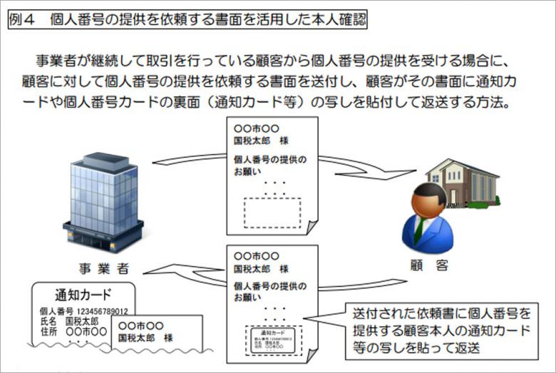 「個人番号の提供依頼書類に、顧客が通知カード等の写しを添付して返送することで、(中略)依頼書類に印字した住所及び氏名と添付されている通知カード等の写しの住所及び氏名が同一であることを確認することにより、身元(実在)確認を行います」と書かれています。
