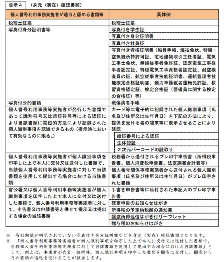 国税庁が発行する「国税分野における番号法に基づく本人確認方法【事業者向け】」の17ページにある表は、身元(実在)確認書類をまとめたものです。ここでは「個人番号利用事務実施者が適当と認める書類等」の1つとして、「個人番号利用事務実施者等が個人識別事項を印字した上で本人に交付又は送付した書類で、当該個人番号利用事務等実施者に対して当該書類を使用して提出する場合における当該書類」が挙げられています。