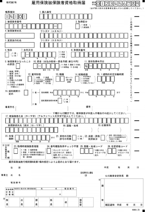 雇用保険に関して、入社して最初に提出する書類は「雇用保険被保険者資格取得届」です。この届出書の様式を皆さんが見たことがないのは当然です。社員ではなく、事業主が作成してハローワークに提出しているからです。最上段中央に個人番号記入欄があるのが分かります。