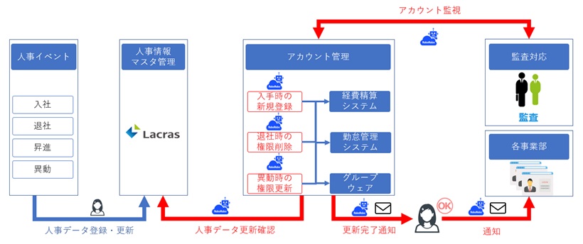 サービスの第1弾として、ラクラス社が提供する大企業向け人事クラウドサービス「Tokiwagi(常盤木)」の人事データに基づいて、従業員の入退社、異動に伴い発生する各種クラウドサービス(経費精算システム、勤怠管理システム、グループウェア、メール、ワークフローシステム、就業管理システム等)の権限付与、更新、削除を代行するロボットサービス「RoboRoboアカウントマネジメント(仮称)」を共同で開発、販売いたします。