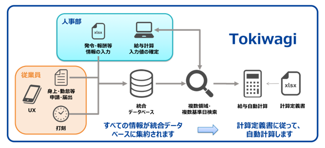 Tokiwagiのもう一つの特長は、大企業が人事システムに要求するワークフロー、タイムカード、給与計算、タレントマネジメント等のすべての機能を一つのシステムに統合していることです。すべての人事情報を一つのデータベースに統合した結果、Tokiwagiは給与計算の自動化にも成功しました。